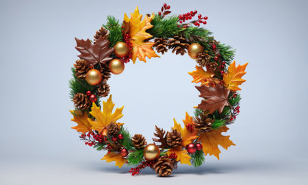 A fall-themed wreath decorated with pine cones, leaves, and berries sits on a plain background