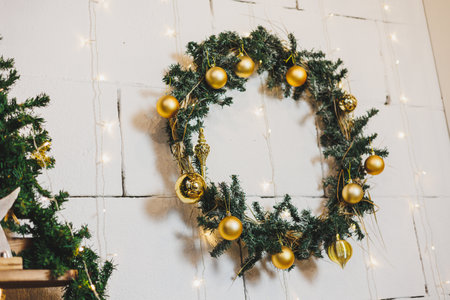 New Year interior. Wreath of spruce with garland. Christmas decorations. Holiday concept
