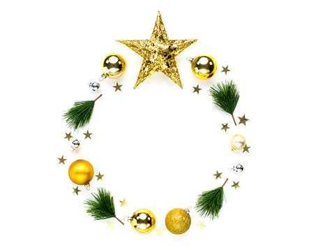 Christmas circle floral composition. Wreath of cypress, eucalyptus branches, pine cones, rowan berries, anise, confetti stars and sea holly flowers on white background.