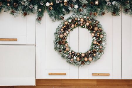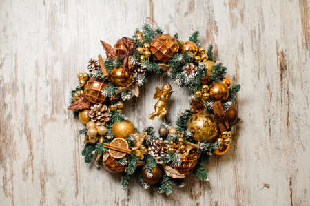 Beautiful Christmas wreath made of fir tree and stylishly decorated with cinnamon sticks, glass balls and toys in golden tones