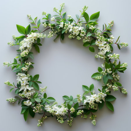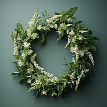a wreath of green flowers and buds on a dark colored background, featuring light white and light indigo tones. this minimal retouched image showcases a restored and repurposed wreath in a realistic still life style. the uhd image captures the intricate details of nature-inspired installations and sculpted floral arrangements. ai generated