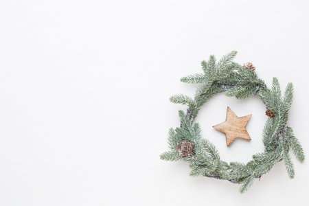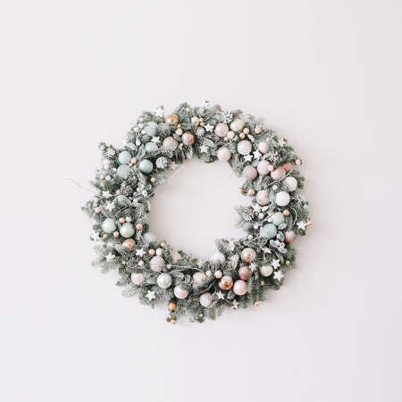Christmas greeting card. Wreath decoration on white wooden background. New Year concept. Copy space. Flat lay. Top view.