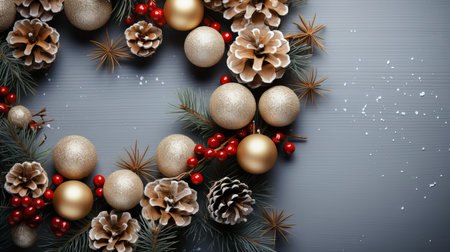 A close-up shot of a dark blue surface decorated with Christmas ornaments, pine cones, and sprigs of greenery.