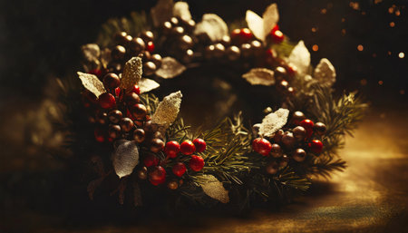 A beautifully arranged Christmas wreath adorned with red berries and surrounded by gold ornaments showcases a festive, elegant holiday spirit on a dark surface.