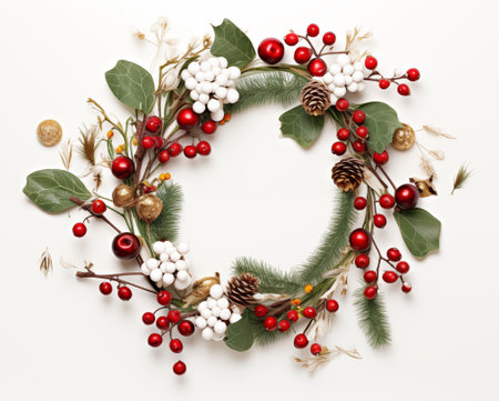 Christmas wreath on white background. Flat lay, top view. AI generated illustration
