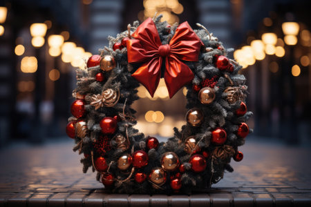 This exquisite Christmas wreath showcases an arrangement of ornaments and fairy lights, creating a warm, festive atmosphere perfect for holiday celebrations.