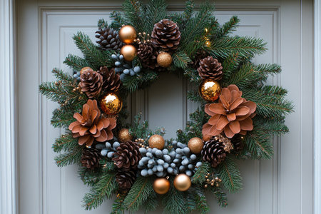 Elegant Christmas wreath adorned with red berries, pine needles, and golden ornaments, perfect for holiday decor