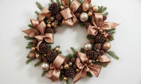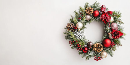 A festive Christmas wreath, composed of lush green pine branches, eucalyptus leaves, and delicate ornaments, hangs against a clean white background, creating a minimalist holiday aesthetic.