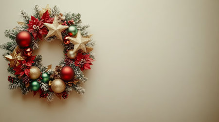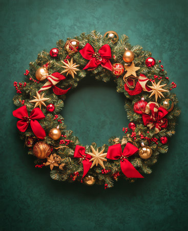 Beautifully decorated Christmas wreath with red and gold ornaments on a festive backdrop