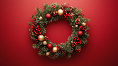 A circular wreath of fir branches and holiday decorations on a red background, perfect for designing Christmas cards, social media posts, or promotional materials.