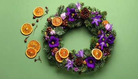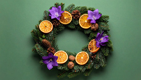Christmas wreath made of fir branches, dried oranges and flowers on green background