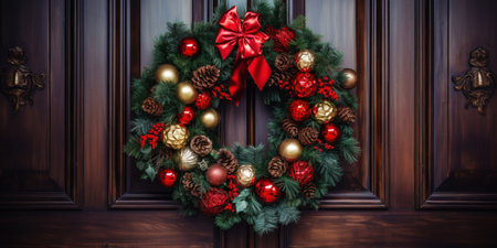 Colorful Christmas wreath features rich red bows, shiny golden ornaments, and natural greenery, creating a festive display for holiday celebrations.
