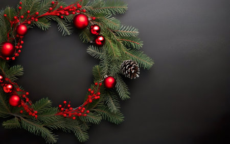 Merry Christmas wreath on a dark background, copy space at the right. AI Generative