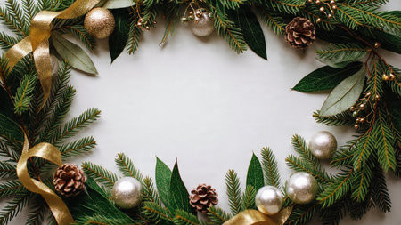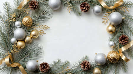 A calm white center bordered by pine greenery and sparkling gold-and-silver ornament clusters.