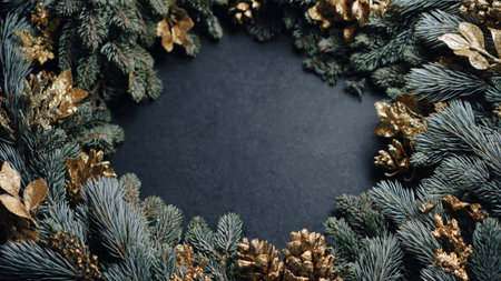 Generative AI : Frame with christmas wreath on dark background top view Merry christmas greeting card Winter xmas holiday theme Happy New Year Flat lay Twinkle glitter bokeh light