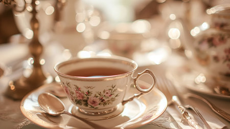 A delicate tea cup and saucer on a luxurious table setting with gold accents