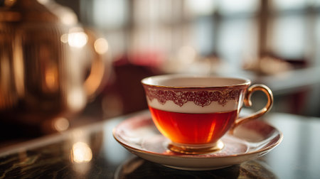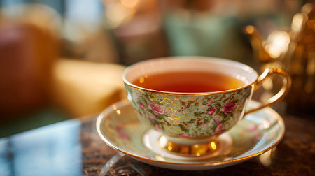 A cup of tea on a marble table in a luxurious setting with gold accents