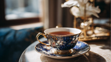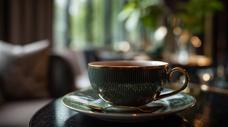 A luxurious tea cup and saucer on a dark table in a cozy room