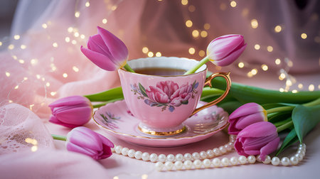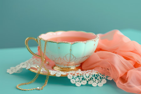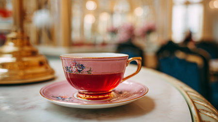 A delicate pink teacup filled with red tea on a saucer in a luxurious setting
