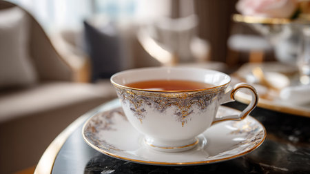 A delicate tea cup and saucer on a marble table in a luxurious room
