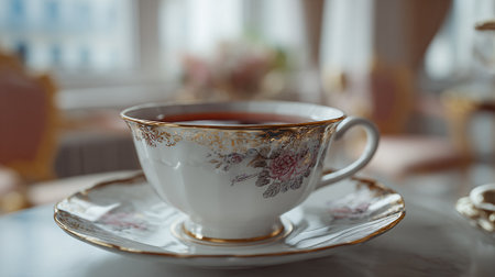 A delicate tea cup with floral design on a saucer in a cozy indoor setting
