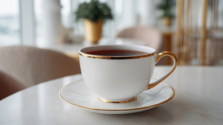 A delicate tea cup with gold accents sits on a matching saucer in a cozy cafe