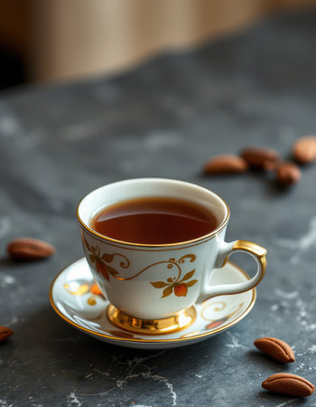 Warm tea served in a delicate cup with almonds scattered on a dark stone surface