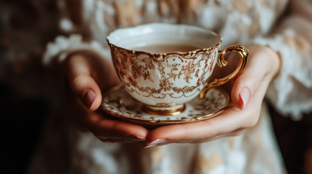 A delicate tea cup with gold trim sits on a matching saucer in a luxurious setting