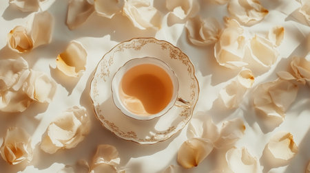 A beautiful tea cup filled with warm liquid rests on a soft surface, surrounded by delicate rose petals, creating a serene and elegant atmosphere perfect for relaxation.