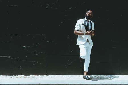 An elegant handsome bald bearded African-American guy in a fashionable white costume with a necktie and a smartphone in his hands is leaning against a black wall, with a copy space place on the left