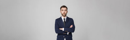 portrait of a handsome serious young businessman wearing an elegant suit and crossing his arms.