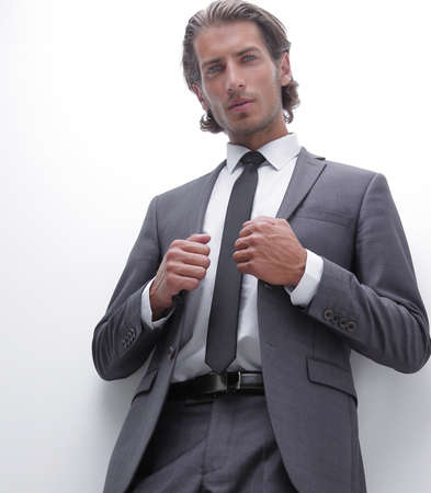Handsome stylish man in gray suit on a white background. Businessman portrait with copy space.