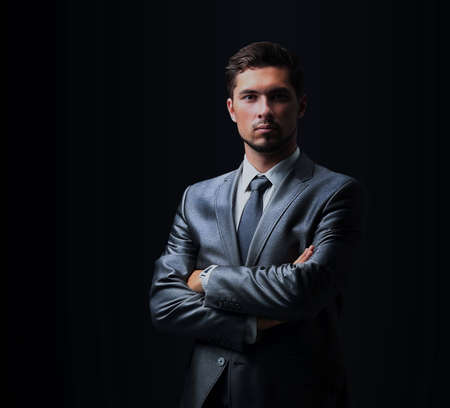Young successful businessman posing over dark background. Isolated White Background. Copy space.