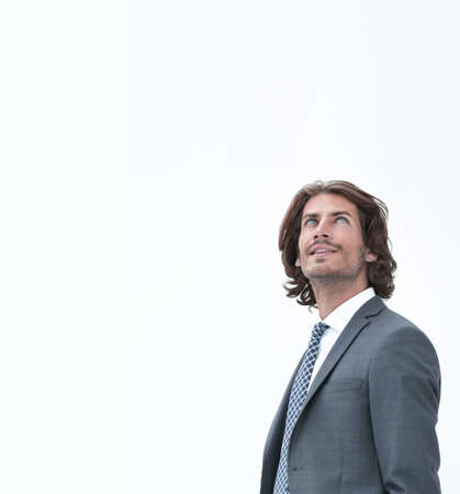 Cheerful young man looking ahead and feeling excited about the future. Business man smiling next to copy space