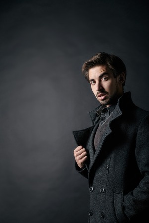 Fashion Shot of a young handsome man in coat on black background