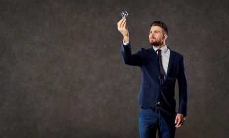 Businessman with luminous light bulb in hand on copyspase background.