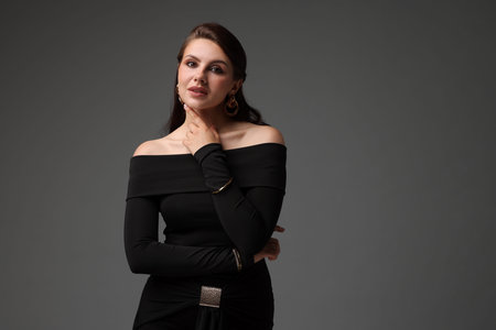 Young woman in stylish black dress on grey background