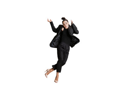 Studio shot of young woman in business style attire in action, motion isolated on white background. Art, sport, beauty, fashion concept.