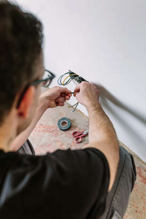 Unrecognizable male electrician wrapping cable with electrical tape on the electrical installation of a house