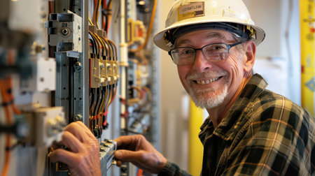 In a lively workshop, an elderly technician expertly adjusts electrical panels, showing his skill and dedication.