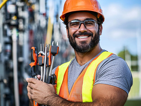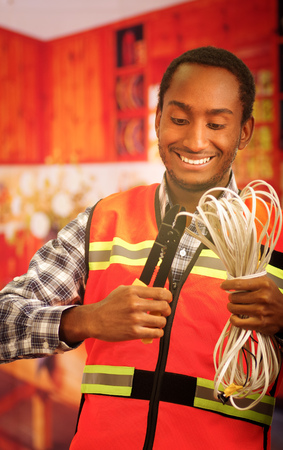 Young electrical worker wearing safety vest, holding cables and cable pliars, smiling with great positive attitude.
