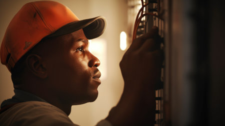 Confident electrician carefully wiring building's electrical system. His focus on safety and precision evident as they work to provide reliable power distribution. Generative AI