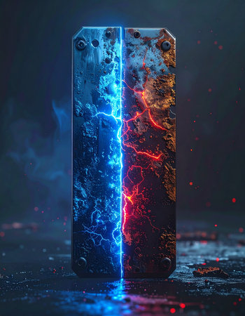 An illuminated rectangular pillar is depicted with electric energy flowing through it, generating a lightning effect. The image showcases a dark, blurred background and a shallow depth of field, highlighting the central object. The composition uses cool blue tones with a digital art style. It could be used in science, technology, or creative design projects.