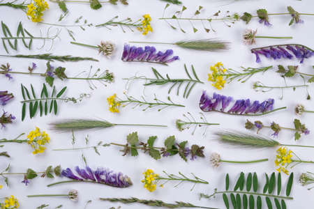 bright summer white background with wild colorful flowers and herbs and leaves, floral background or texture.