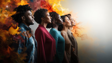Group of young african american women and men looking side with illustration colorful smoke splash.