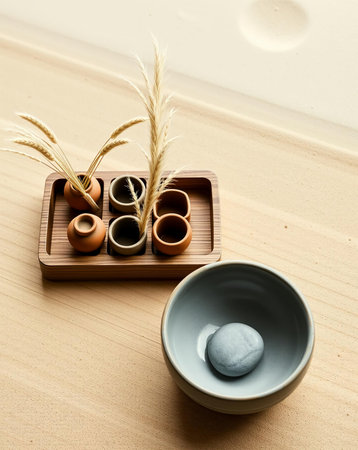 A visually appealing arrangement featuring small pots, a bowl with a stone, and plants on a wooden surface, creating a minimalist aesthetic.