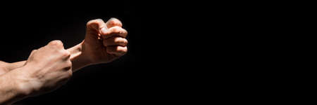 Two male fists isolated on black background.Headline.