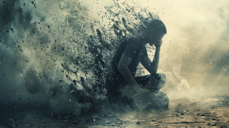 A man with his hands covering his face is covered in smoke, AI