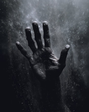 Hand reaching into muddy ground, exploring texture and nature, depicting human interaction with the earth, set against a dark, earthy background, capturing the essence of connection with nature