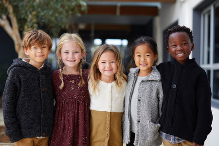 Happy diverse children posing together at junior school during a sunny day, showcasing friendship and joy in an educational environment with their bright smiles